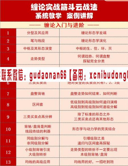 缠论实战筋斗云战法 系统教学案例讲解 缠论入门与进阶 1分型及其应用 论形态学发端 2笔与线段 缠论形态学演化 3中枢及其形态演变 中枢的生、住、坏、灭 何谓趋势、何谓盘整 4走势类型 探秘完全分类 5走势类型转换的判断依据 背驰 6绝对安全的买卖点只有1,2、3类 三类买卖点 7盘整背驰 盘整走势如何结束、如何判断 8低级别到高级别如何递归演绎 高级别到低级别如何逐级分解 ...